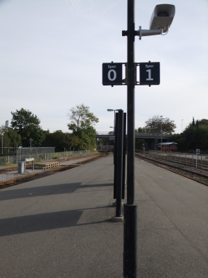 苦し紛れの0番線表示と駅名表示の一体写真。左の柱に0番表示が、向こうに見える2番線・3番線ホームの、向かって右の柱の表示に
